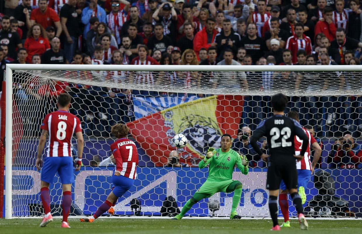 Atletico Madrid’s Antoine Griezmann (7) scores a penalty, the second goal of his team, during the Champions League semifinal second leg soccer match between Atletico Madrid and Real Madrid at the Vicente Calderon stadium in Madrid, Wednesday, May 10, 2017. (AP Photo/Francisco Seco)